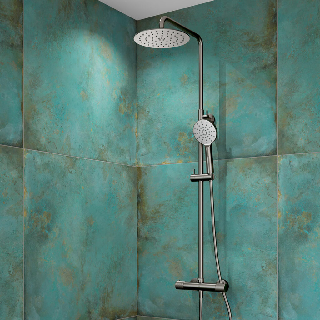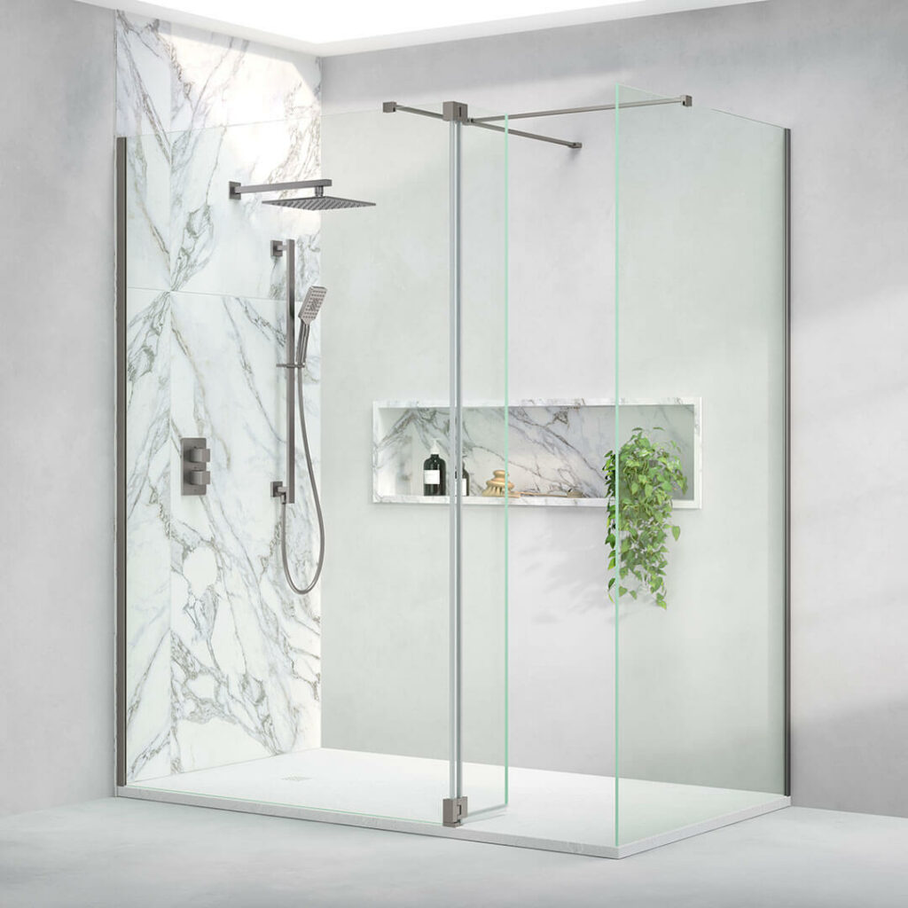 Or to completely customise your showering space, our Emmi Wetroom panels allow you to choose your size of glass, gun metal profile and gun metal extras.