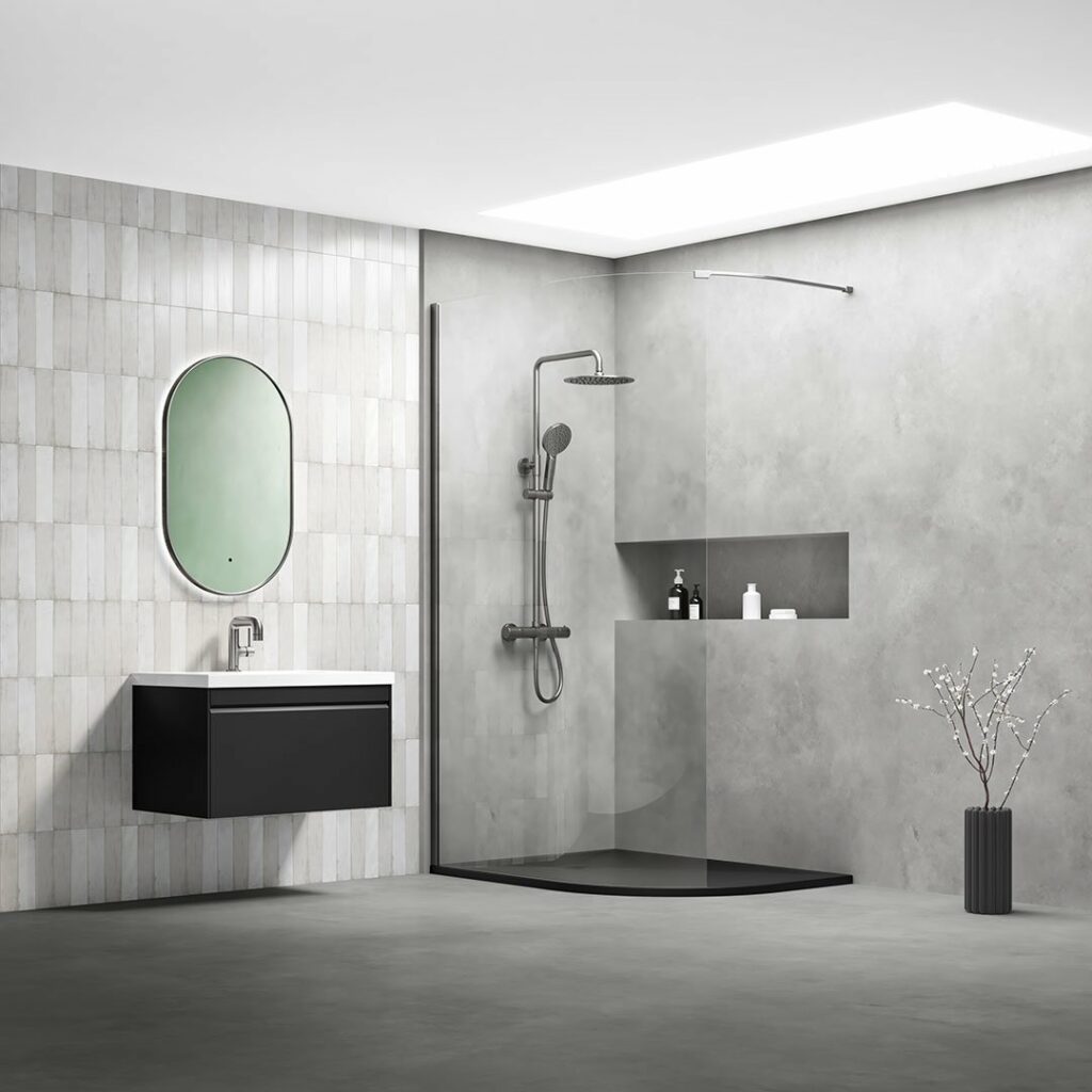 If you’re feeling bold and want to make a statement, consider incorporating larger gun metal elements in your bathroom. A gun metal shower enclosure with gun metal frames can become a striking centerpiece, adding drama and luxury to your bathroom design. Our Emmi Curved Wetrooms make an excellent statement piece, effortlessly blending elegance and industrial flair, creating a truly unforgettable space.