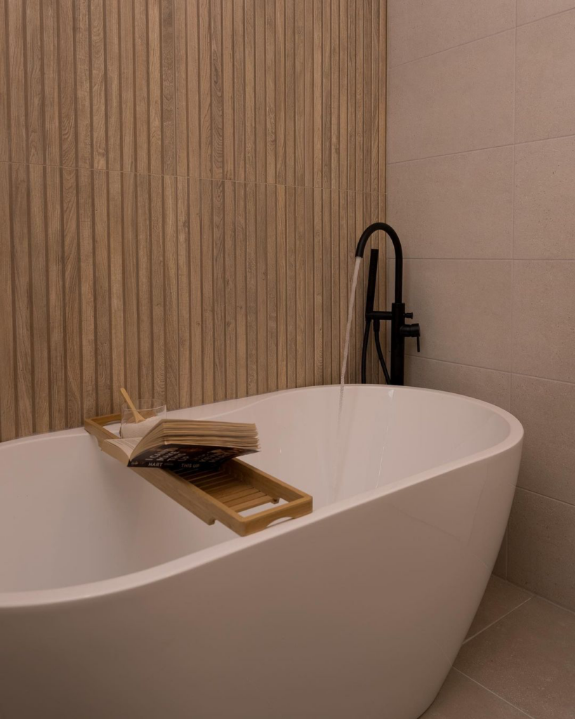 Mixed neutral tones and textures complete with our Cian LED Mirror, Hampton Oak Vanity Unit with Carrara Marble Worktop, Freestanding Mari Bath and Black Tapware create a clean relaxing space for this lucky customer.