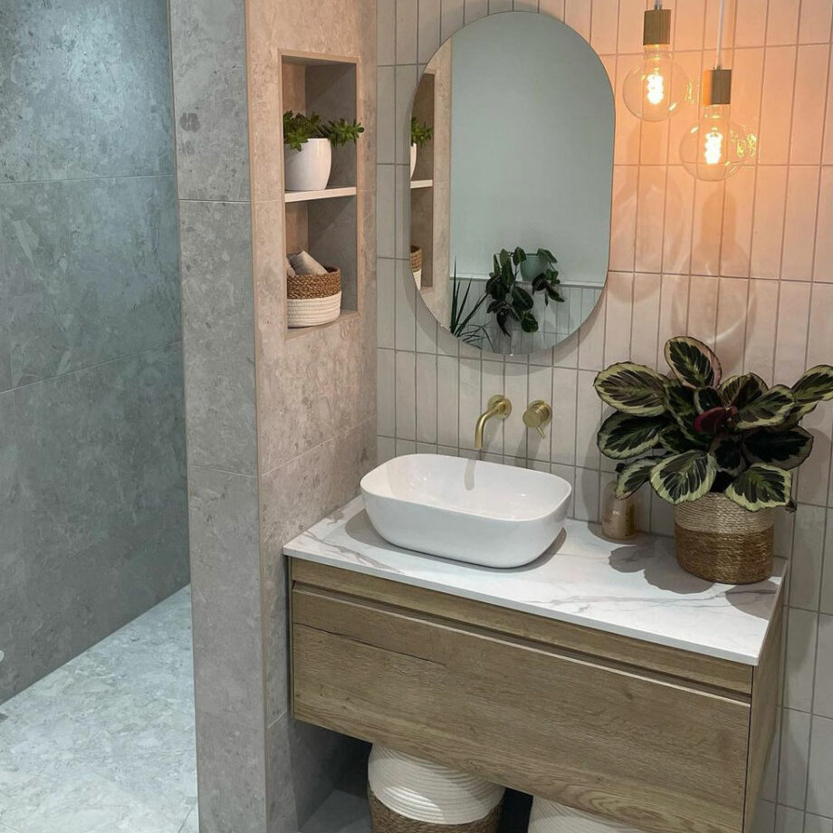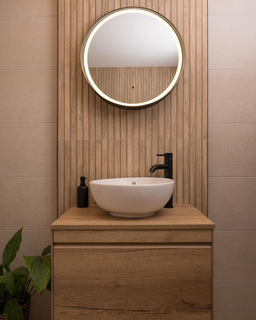 Black accents contrast beautifully with the natural wooden decor, creating a relaxing Spa inspired atmosphere. Our Cian LED Mirror with shelf is both functional and stunning and it along with our Hampton worktop