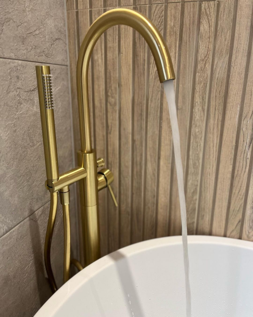 The beauty of a neutral toned bathroom is that you can accessorise it with virtually any colour of brassware but one of our faves has to be brushed brass and neutral.
