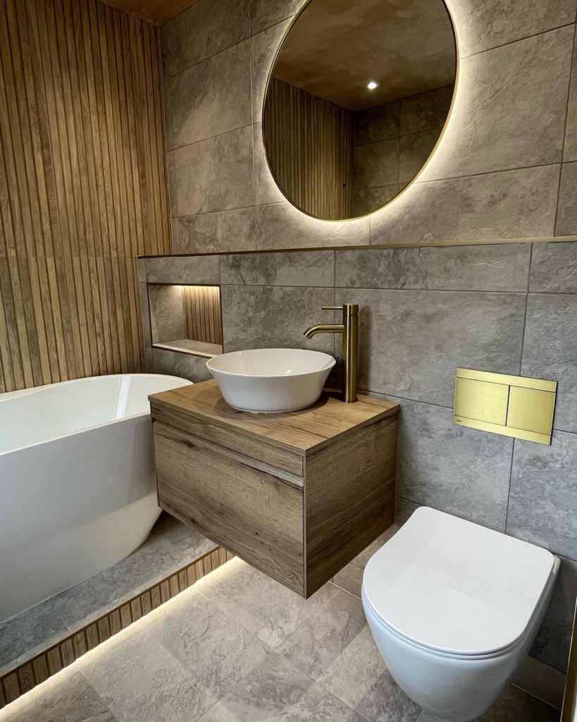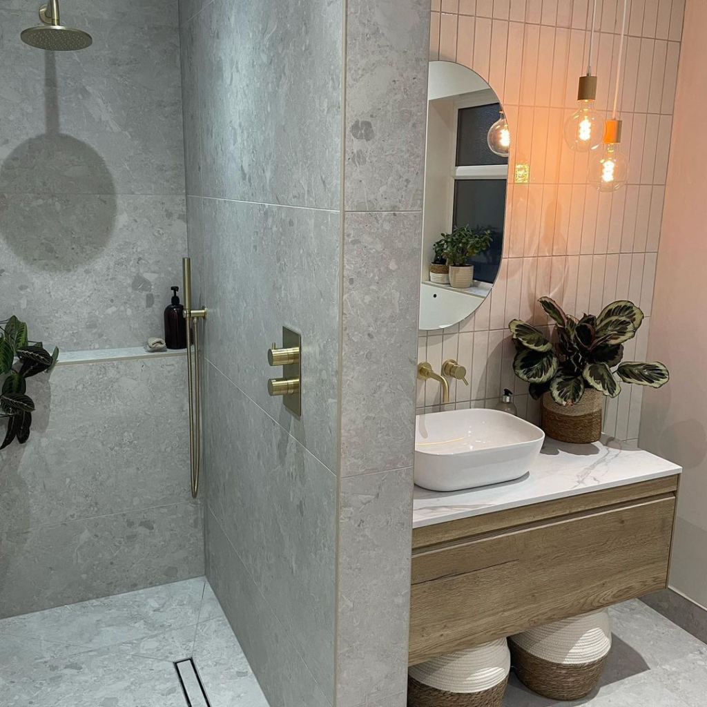 Featuring a bathroom vanity with neutral toned tiles and our Hampton Oak Vanity Unit with Carrara Marble Worktop.  This bathroom has used a grey tiled statement shower room which