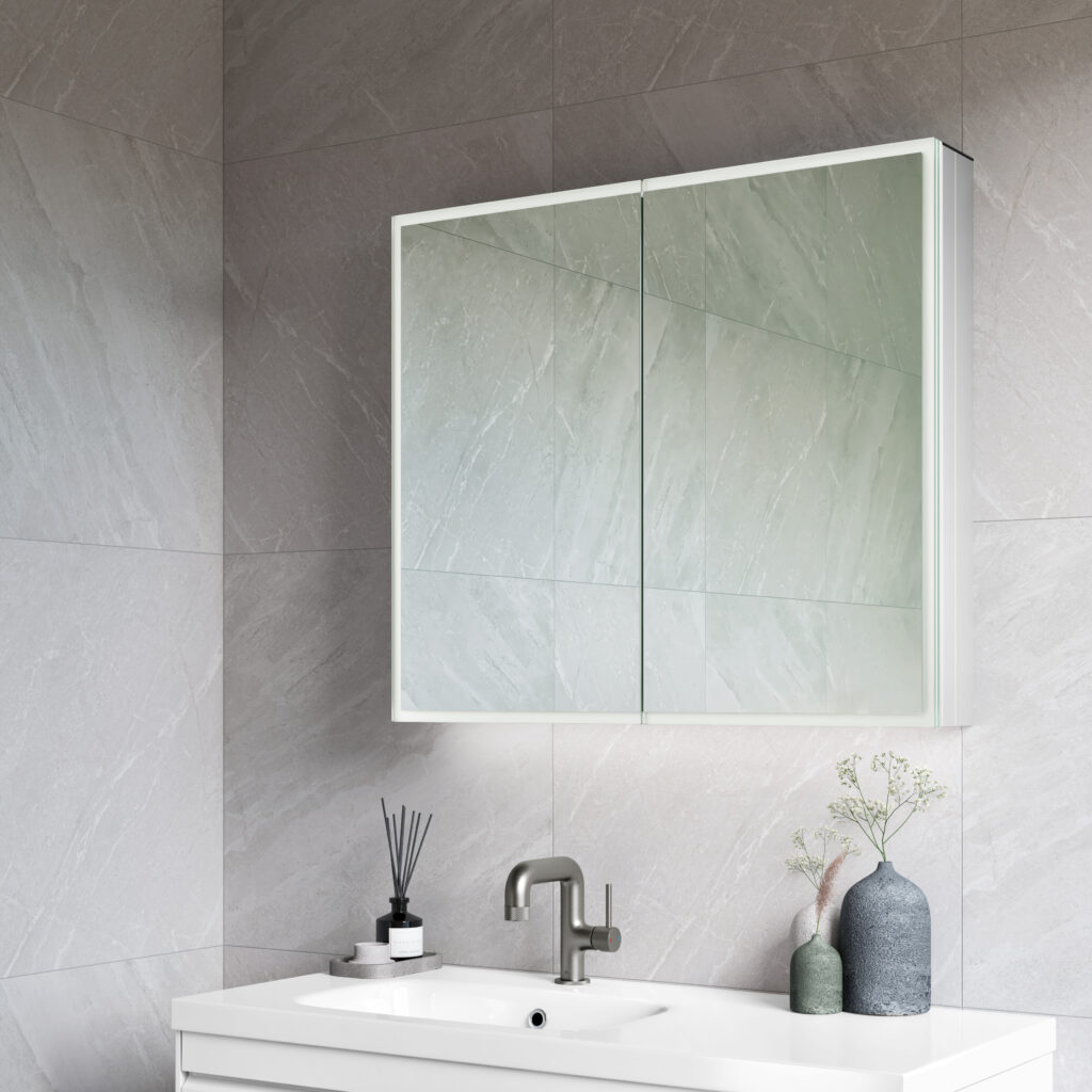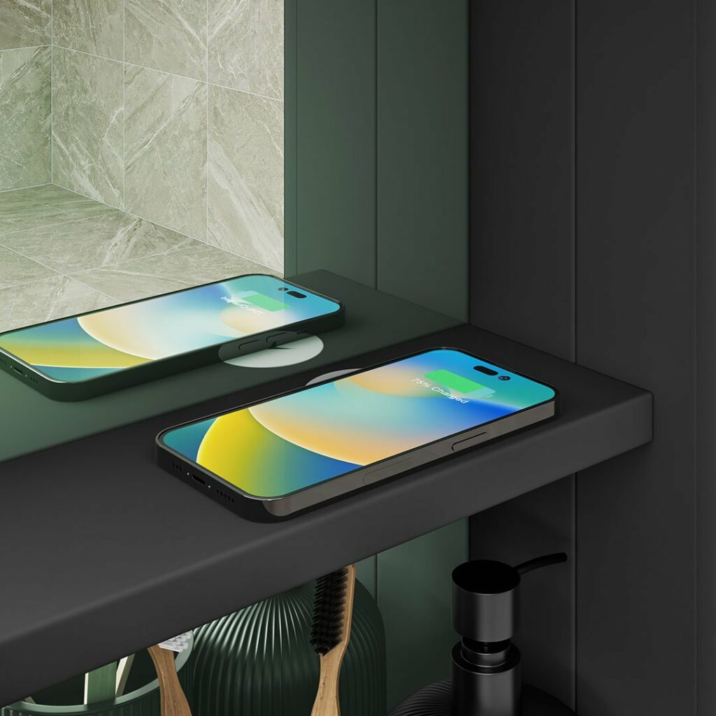Take a look at our new Keely LED Mirror cabinet which combines a wireless charging station, charging socket, and an Ambient Downlight.